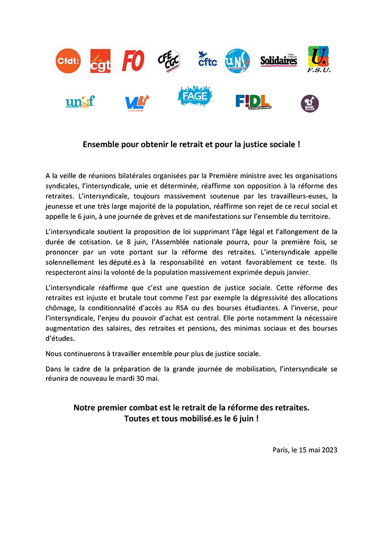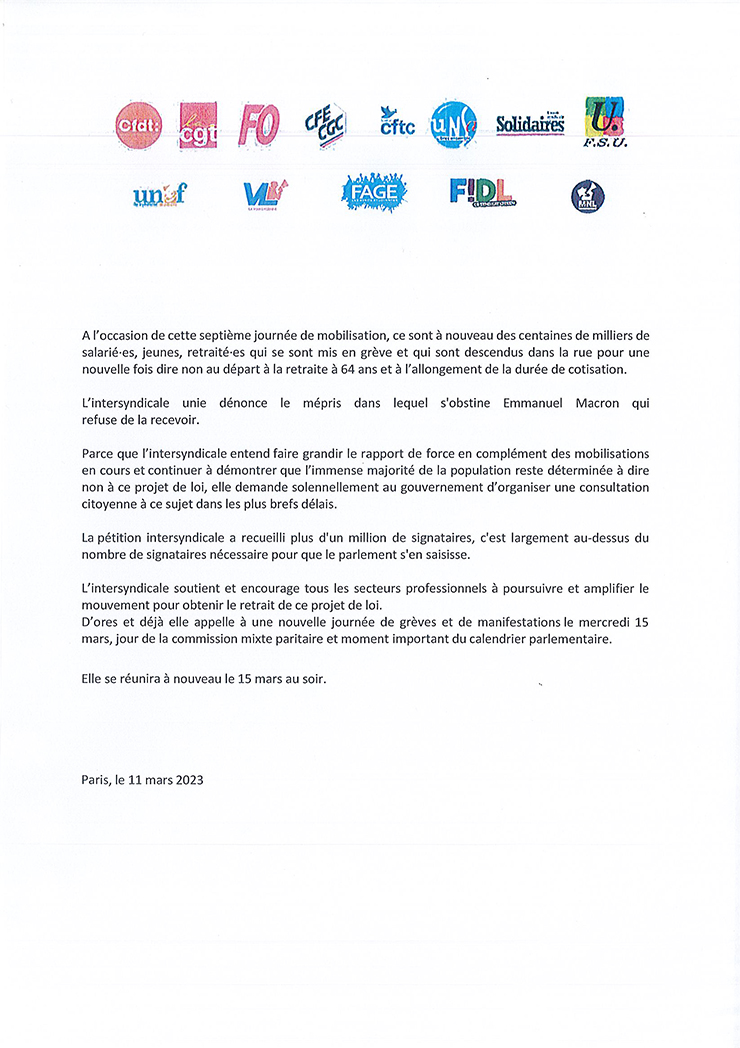 Communiqué intersyndical du 11 mars 2023