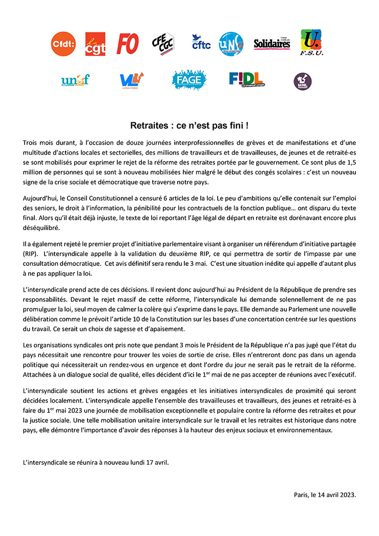 Compte rendu intersyndical du 14 avril 2023