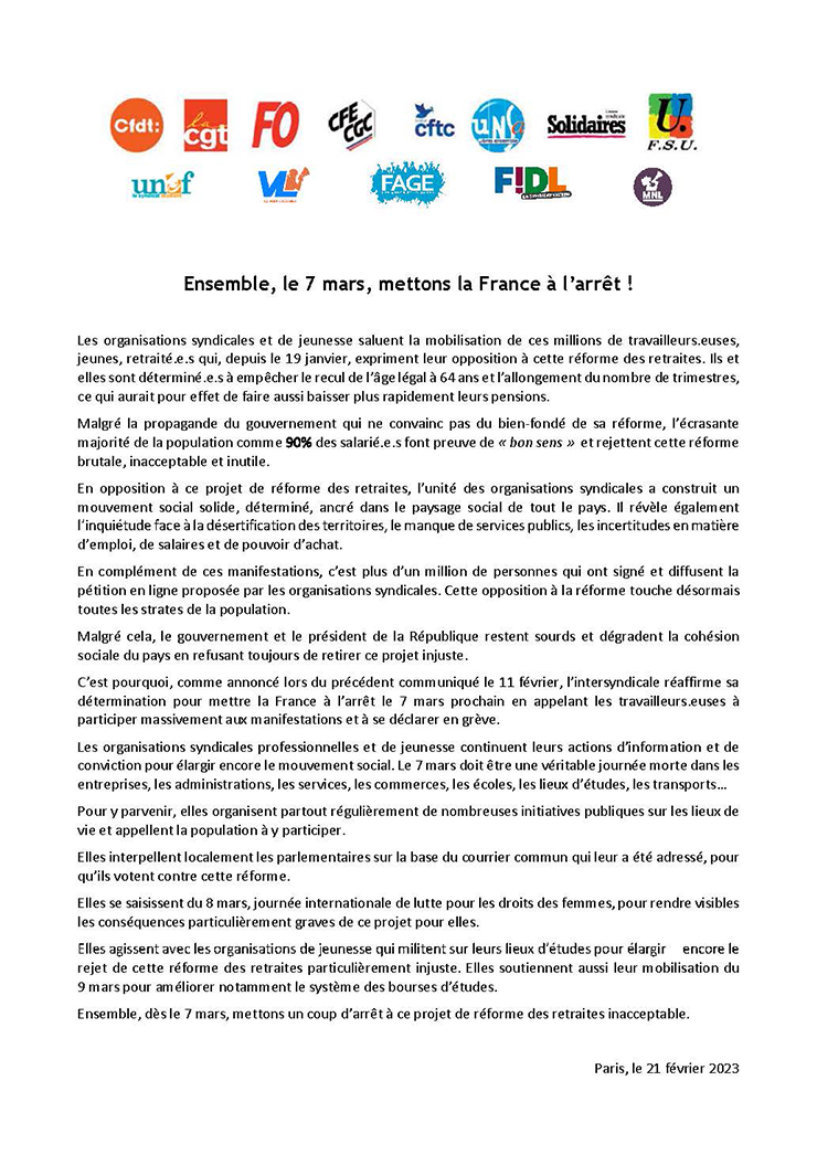 Communiqué Intersyndicale du 21/02/2023