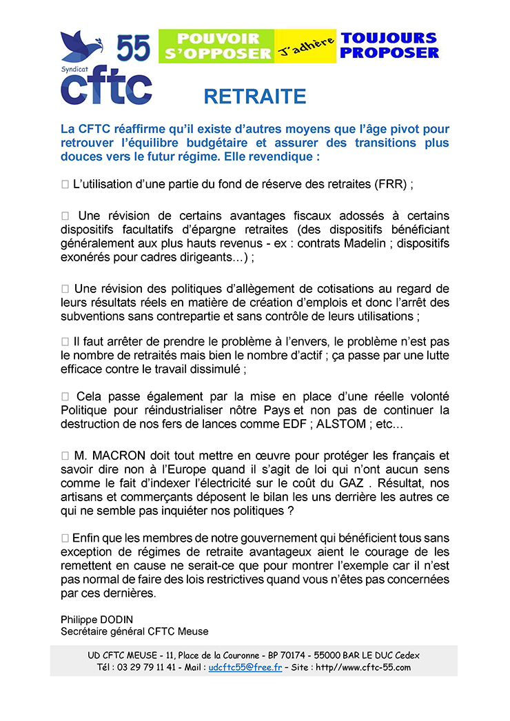 - De demander une audience aux 2 sénateurs de la Meuse, de préférence avant que le texte de la réforme des retraites arrive au Sénat. Une pétition en ligne et en format « papier » interpellant les sénateurs sera également diffusée (basée sur le texte intersyndical national).