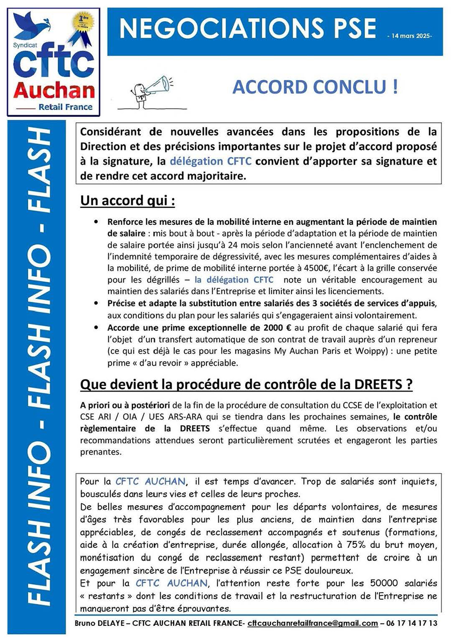 L'accord sur le PSE chez AUCHAN a été signé par les organisations syndicales. Vous pouvez télécharger ce document au format pdf en suivant ce lien : Accord PSE AUCHAN 19 mars 2025